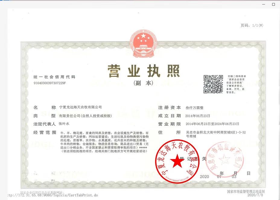 寧夏龍達(dá)海天農(nóng)牧有限公司 此公司營業(yè)執(zhí)照已上傳驗證